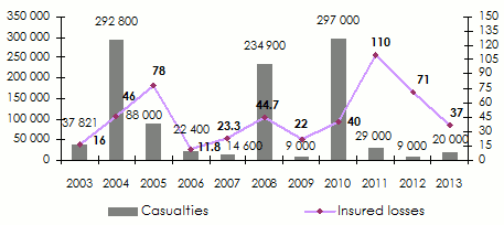 Worldwide insured losses and number of casualties of natural catastrophes: 2003-2013 period