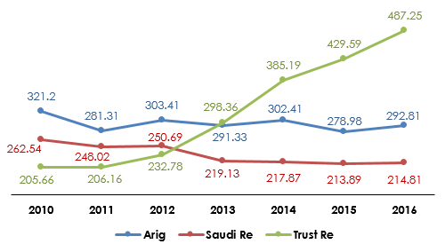 Arig vs Saudi Re vs Trust Re: evolution of net result (2010-2016)
