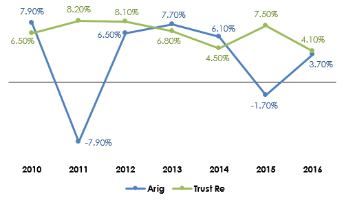 Arig vs Trust Re: evolution of Return on Equity (2010-2016)