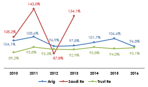Arig vs Saudi Re vs Trust Re: evolution of combined ratio (2010-2016)