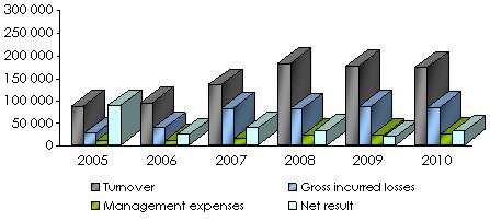Unrestrained competition which reigns in the United Arab Emirates and in the entire region has not kept Emirates from achieving outstanding results. For the 2005-2010 period, the average underwriting results amounted to 11% of the written premiums while the net income reached 27% of the same written premiums. The average loss ratio (2005-2010) is below 50% and the combined ratio sky-rocketed at 77.8% in 2007 to later settle around 62%.