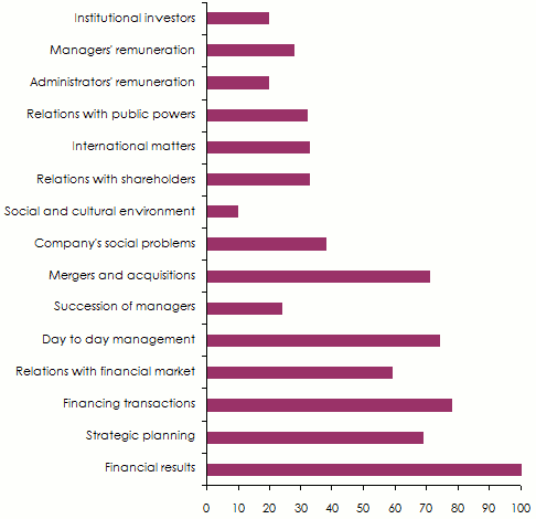 Among the six most important concerns on the mind of the boards, four themes of financial nature were listed: financial results, financing operations, mergers and acquisitions, and relations with financial markets. The review of current management is only the third concern for the directors. Moreover, it seems that the topics most regularly addressed by the boards of directors relate to short-term issues.