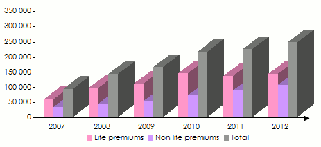 The growth reported by the main classes of business has been sustainable, with life and non-life insurance doubling the premiums volume since 2007. However there is a slight slowdown for the non-life business in 2012 compared to 2011.