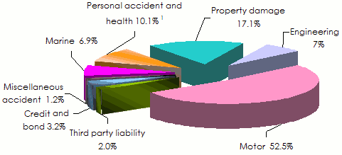 In 2011, motor insurance accounted for over 72% of premiums. The property damage class of business, which ranks second, represents only 11% of the total premiums.