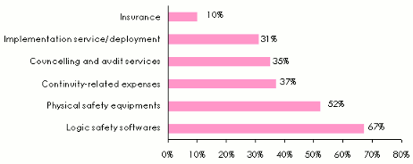 The number of large companies endowed with a budget allocated to computer security is estimated at 35%. As shown below, the purchase of security software accounts for 67% of the budget assigned to companies’ protection and prevention. The amounts allocated to insurance account for just 10% of the security budget.