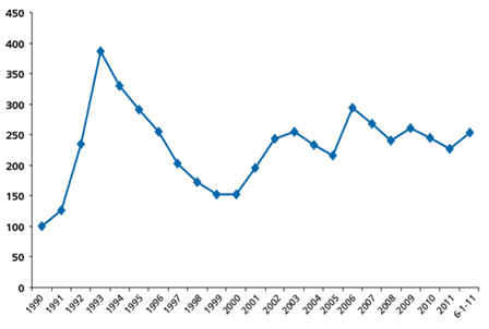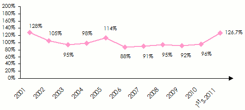 Evolution of the non life combined ratio for the 2001–2011 period (average of the 24 reinsurers rated by Fitch as at the first semester 2011)