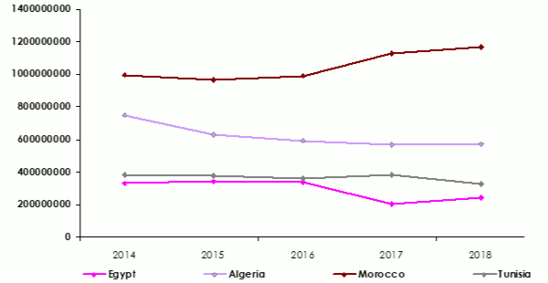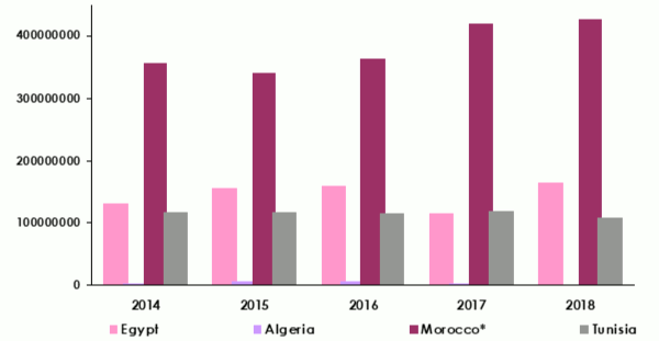 Morocco* | 355 994 000 | 341 309 000 | 362 816 000 | 420 453 000 | 427 435 000 |