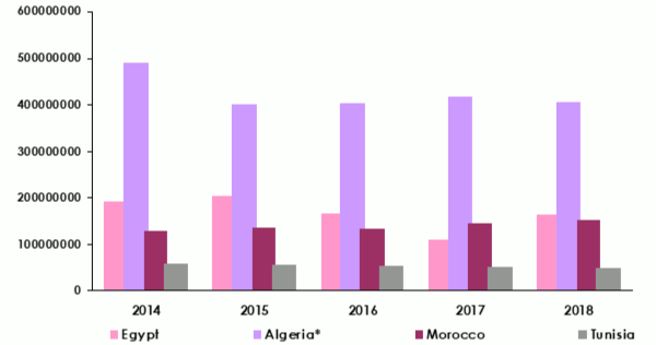 Algeria* | 490 204 000 | 400 883 000 | 402 160 000 | 415 408 000 | 403 668 000 |