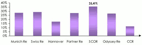 In 2000, in terms of written premiums, the ratio between SCOR and the world's largest reinsurer, Munich Re, was 1 to 9 (when SCOR accepts a dollar Munich Re accepts 9). By December 31, 2012, this ratio went up from 1 to 2.96.
