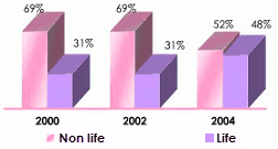 In order to meet solvency requirements, SCOR adopted a strict underwriting policy and reduction of its operations in the United States. Between 2002 and 2004, the volume of collected premiums was divided by two. The non-life portfolio was heavily cut unlike the life portfolio which performed better. In 2002, 30% of business came from life insurance compared to 70% for non-life. In 2005, the non-life sector accounted for only 52% of the total business underwritten. Redeployment was gradually carried out towards the emerging markets endowed with strong potential.