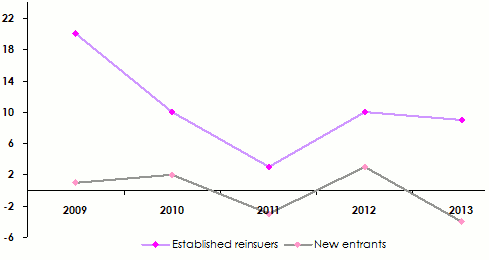 ROE’s evolution of established and new entrants reinsurers: 2009-2013