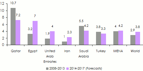 Growth estimates of the region remain optimistic in the short and medium term for oil exporters in particular. The recovery of global demand should lead to an acceleration of the consumption of energy products. The oil and gas revenues are likely to strengthen public investments leading to a diversification of the economies concerned (early June 2014, infrastructure investments reached 405 billion USD in the Gulf). Despite the political and social tension, the International Monetary Fund is forecasting an average growth of over 4% for the Gulf in the medium term.
