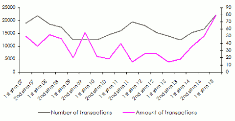 In the first half of the current year, the amount of the transactions realized in non life insurance and reinsurance went up by 290% in comparison with the same period of 2014. The number of transactions rose by 73% from 44 transactions during the first half of 2014 to 76 in the same period of 2015.