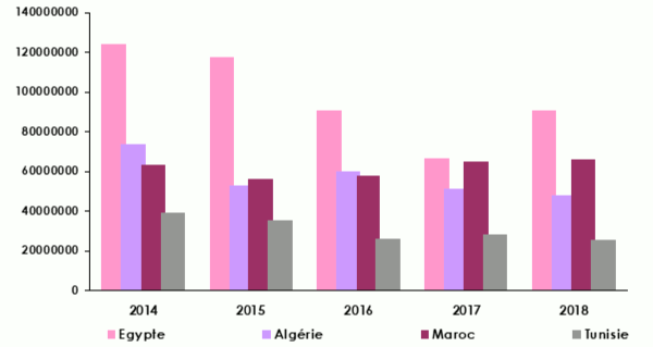 Tunisie | 38 975 000 | 35 070 000 | 25 657 000 | 28 242 000 | 25 286 000 |