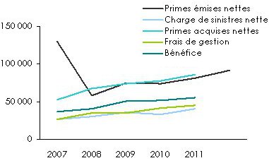 Evolution des primes, sinistres, frais de gestion et résultat: 2007-2011