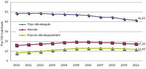 Lignes de téléphone fixe par 100 habitants 2000-2010
