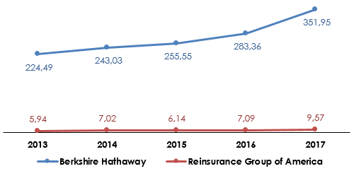 Berkshire Hathaway vs Reinsurance Group of America : évolution du chiffre d’affaires (2013-2017)
