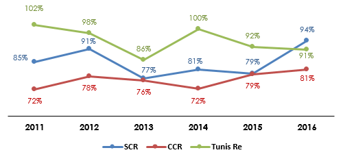 CCR vs SCR vs Tunis Re : évolution du ratio combiné (2010-2016)