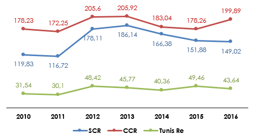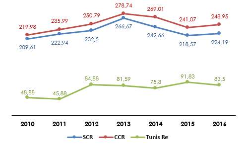 CCR vs SCR vs Tunis Re : évolution du chiffre d’affaires (2010-2016)