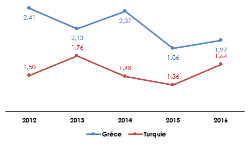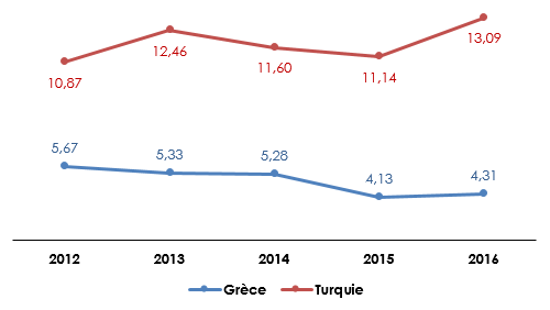 Turquie vs Grèce : évolution du taux pénétration de l’assurance (2012-2016)