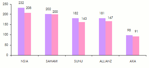 A noter le faible impact de NSIA sur le marché camerounais (4,3%). Dans la branche vie, NSIA Mali accapare à elle seule 53,4% du marché.