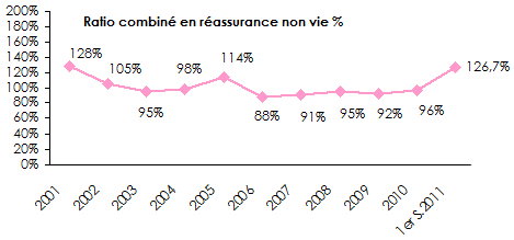 Au premier semestre 2011, le ratio combiné moyen des 24 réassureurs notés par l'agence de notation Fitch atteint 126,7%. Les prévisions de fin d'année devraient se situer autour de 108% contre 96% en 2010.