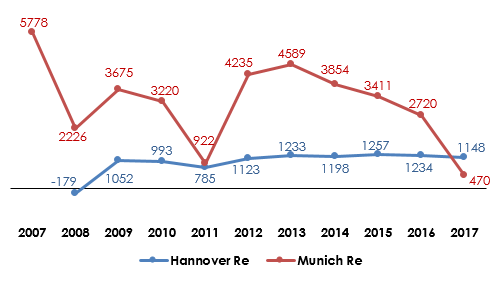 Hannover Re vs Munich Re : evolution of net result (2007-2017)