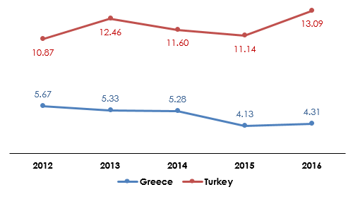 Turkey vs Greece: evolution of insurance penetration rate (2012-2016)