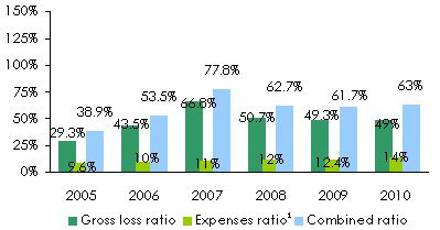 Unrestrained competition which reigns in the United Arab Emirates and in the entire region has not kept Emirates from achieving outstanding results. For the 2005-2010 period, the average underwriting results amounted to 11% of the written premiums while the net income reached 27% of the same written premiums. The average loss ratio (2005-2010) is below 50% and the combined ratio sky-rocketed at 77.8% in 2007 to later settle around 62%.