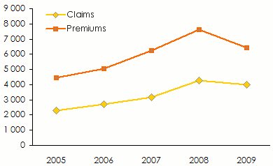 in USD| 2005 | 2006 | 2007 | 2008 | 2009 | 2009 market shares | 2009 combined ratio | |