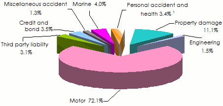 In 2011, motor insurance accounted for over 72% of premiums. The property damage class of business, which ranks second, represents only 11% of the total premiums.
