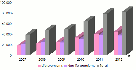 The growth reported by the main classes of business has been sustainable, with life and non-life insurance doubling the premiums volume since 2007. However there is a slight slowdown for the non-life business in 2012 compared to 2011.