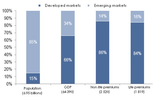 The global market has reported a premiums volume of 4 595 billion USD in 2011. From 2001 to 2011 the average annual growth has been about 7%. This growth is strongly correlated with the GDP which grew during the same period by 5.6% in developed countries and by 13.9% in the so-called emerging countries.