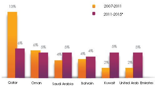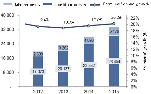 The premiums volume generated by Gulf countries reached 14.730 billion USD in 2011. During the 2006-2011 period, overall premiums multiplied by 2.35, which corresponds to an average annual growth rate of 18.7%, with life insurance increasing by 21.2% and non-life insurance reporting an 18.3% rate.