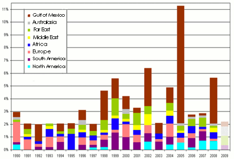 Frequency of claims per geographic zone in % of the number of platforms. Losses over 1 million USD