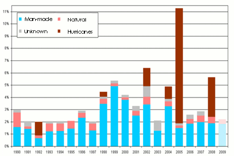 The market of offshore energy insurance is volatile. Its results depend largely on the impact of hurricanes. Following a strong hurricane activity in the year 2000 off the coast of California, insurers have adjusted the terms and conditions of contracts. Insurance costs have become such that some oil companies, mainly in the Gulf of Mexico, prefer self-insurance.