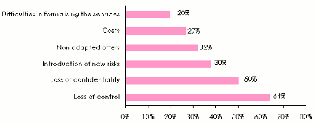 The IT security of large companies is usually ensured by in-house teams. For smaller entities, outsourcing stands as an interesting alternative, providing many advantages such as cost reduction, around the clock (24h/24h) service, greater responsiveness than that provided by in-house teams. In addition, outsourcing provides skills that many medium-sized companies cannot afford even at reasonable costs. However, this solution is not flawless. The chart below lists the main constraints faced by companies when outsourcing their security. The loss of control is the first obstacle to this type of operation, followed by the loss of confidentiality, the introduction of new risks, ...