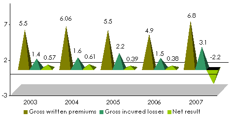 Within a difficult context and despite losses due to an unfortunate investment: its shareholding in Air Mauritania, driven out of business, NASR has managed to maintain a steady course. Despite the emergence of new insurance companies, NASR's technical results are exceptional. With a loss ratio varying between 45% in 2007 and 28% in 2003 and 2004, the company posts an encouraging turnover in a country of diversifying wealth and multiplying resources.