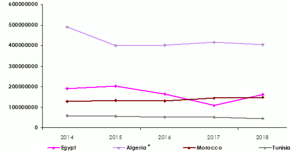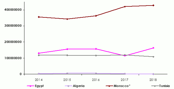 Morocco* | 355 994 000 | 341 309 000 | 362 816 000 | 420 453 000 | 427 435 000 |