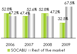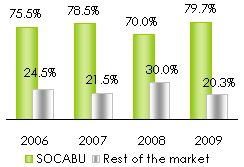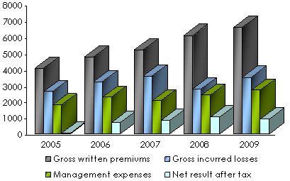 With a +12.8% average annual growth of its turnover between 2005 and 2009, SOCABU has managed to consolidate its position as a leader of the Burundi market. Despite the increase of its loss experience in 2009, the company is posting an excellent result thanks to sound financial incomes. Estimated at about 1.4 million USD, the latter account for 21.5% of the written premiums of the year.