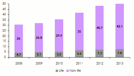 Direct insurance reported strong growth in 2013 in life business (+13%) 1 and more moderate growth in the non life (+2.1%)1 due to the economic downturn in South Africa. This country, alone, generates 90% of the premiums reported on the continent.