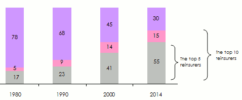 Going back in time to a more remote period, we notice that within thirty years, the market structure has undergone an overhaul. From a rate of 22% in global premiums underwritten by the first ten world reinsurers in 1980, 70% of the very same premiums were in the hands of the ten players by the end of 2014.