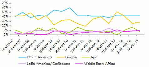 During the first three quarters of 2015, 38% of major operations have been realized at the cross-border level. Asia, Latin America, the Middle East and Africa account for 28% of the operations made worldwide whereas North America and Europe are respectively involved in 43% and 23% of the transactions.