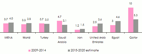 It accounts for a population of 387 million inhabitants. By the end of 2014, the International Monetary Fund estimated the region’s gross domestic product at 3 600 billion USD, that is 5% of the global GDP. For the 2009-2014 period, the average growth of this indicator is set at 3.7% per year for the MENA region compared to 3.3% at the global level.