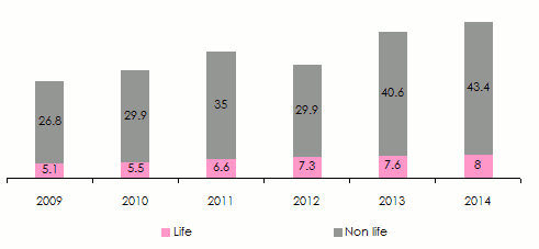 In 2014, the MENA region, as a whole, posted a gross life and non life premium volume of 51.4 billion USD, compared to 31.9 billion USD in 2009. Turkey, Iran,U.A.E and Saudi Arabia grabbed three quarters (3/4) of this amount. Reinsurance, on its part, accounted for 13 billion USD of non life premiums in 2014, that is 30% of the MENA zone non life insurance premiums and 7% of the global level.