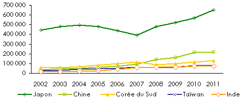 Japon | 445 940 | 478 865 | 494 735 | 478 211 | 439 385 | 393 125 | 483 083 | 522 155 | 571 359 | 655 408 | 46,9% |