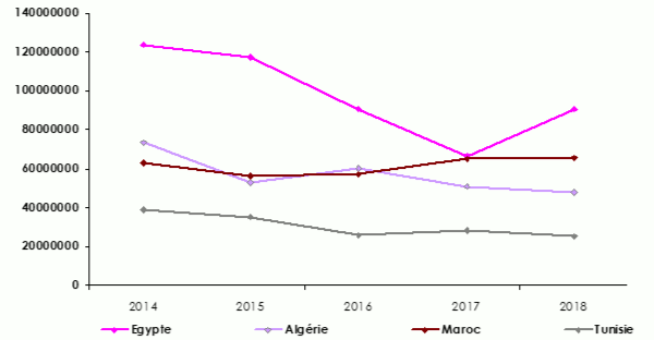 Tunisie | 117 179 000 | 117 760 000 | 115 797 000 | 118 894 000 | 107 029 000 |