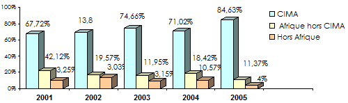 Répartition du chiffre d'affaires par zone 2001-2005