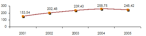 en millions USD| 2001 | 2002 | 2003 | 2004 | 2005 | |