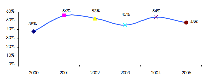 en millions USD| 2000 | 2001 | 2002 | 2003 | 2004 | 2005 | |